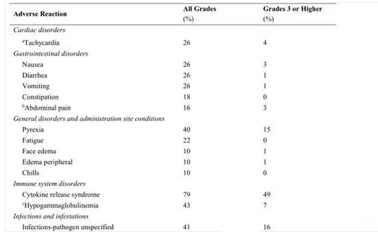 最常見的不良反應(yīng)(發(fā)生率大于20%)包括低丙種球蛋白血癥,感染不明病原體,發(fā)熱,食欲降低,頭痛,腦病,出血,低血壓,心動過速,惡心,腹瀉,嘔吐,缺氧,疲勞,急性腎損傷和譫妄。