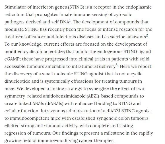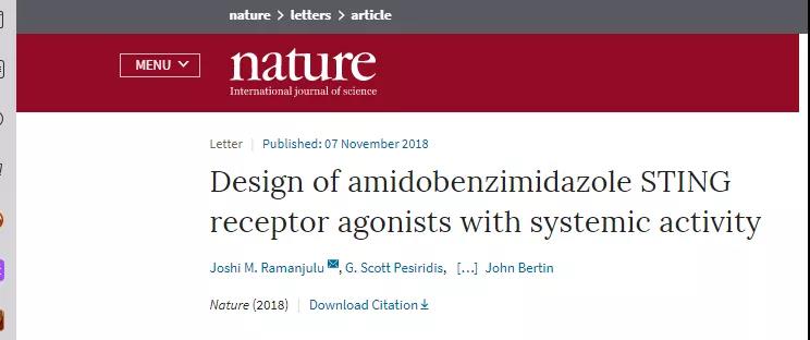 11 月7日,Nature 雜志刊發(fā)了一項(xiàng)最新成果, Joshi M. Ramanjulu 教授等44 名科學(xué)家,共同發(fā)現(xiàn)了一種小分子 STING (干擾素刺激基因),這很可能捅破了腫瘤免疫治療的最后一層窗戶紙。