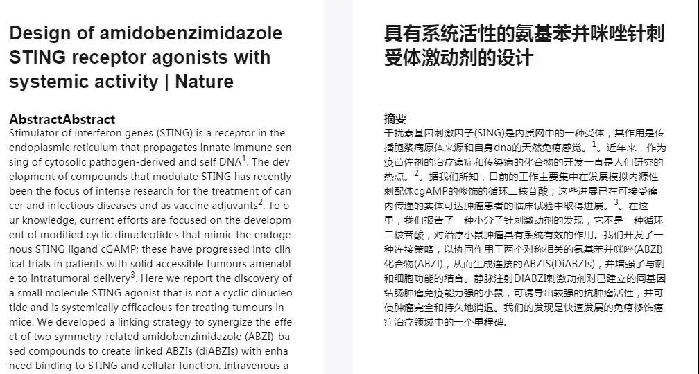 這其中,一種 STING 蛋白引起了科學(xué)家們的興趣。STING 全名叫做干擾素刺激基因(Stimulator of Interferon genes),STING 蛋白是啟動(dòng)機(jī)體天然免疫系統(tǒng)抵御細(xì)菌或病毒感染的重要分子,同時(shí)在激活下游適應(yīng)性免疫應(yīng)答過程中也發(fā)揮著關(guān)鍵作用。簡(jiǎn)單點(diǎn)說,這種蛋白質(zhì)是人體整個(gè)免疫系統(tǒng)的增強(qiáng)激活劑,STING 蛋白的表達(dá)上調(diào),會(huì)增強(qiáng)整個(gè)免疫系統(tǒng)的免疫活性。