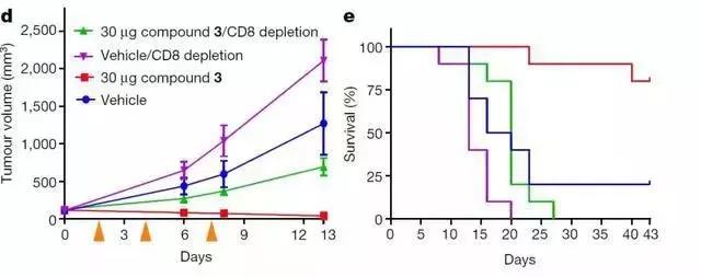 然后,研究人員將新型 STING 蛋白激動(dòng)劑注入到腫瘤小鼠模型中進(jìn)行驗(yàn)證。其最終的結(jié)果令所有研究者震驚,這種新型免疫治療藥物大大增強(qiáng)了小鼠機(jī)體的適應(yīng)性免疫作用,產(chǎn)生持續(xù)的抗腫瘤作用,同時(shí)兼?zhèn)溆屑せ蠲庖哂洃浖?xì)胞的作用,腫瘤組織最終完全消退。