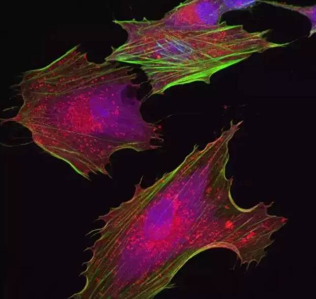 綠色為細胞骨架,紫色為細胞核,紅色為細胞質(zhì)蛋白。