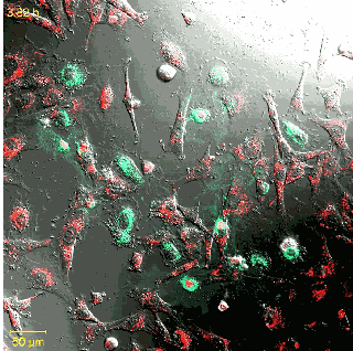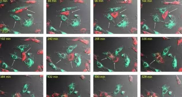 活細胞染為紅色,死亡的心肌細胞染為青色,間充質(zhì)干細胞不斷遷移,箭頭所指部位間充質(zhì)干細胞逐漸與死亡細胞融合成為雙核,400分鐘時死亡的心肌細胞開始奇跡般地復活。