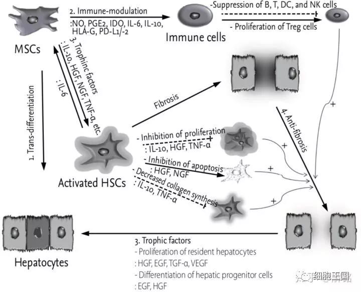 研究證實(shí),間充質(zhì)干細(xì)胞(MSC)治療肝硬化的原理除了細(xì)胞分化外,更傾向于旁分泌作用?,F(xiàn)在在肝病領(lǐng)域的得到很多研究者承認(rèn)的是,MSC歸巢到肝部后,細(xì)胞分化進(jìn)行組織修復(fù)的能力并不高,MSC轉(zhuǎn)分化成肝細(xì)胞樣細(xì)胞的效率很低(中間牽扯MSC的狀態(tài)、分化效率、微環(huán)境以及免疫各種因素),但是MSC的旁分泌機(jī)制對(duì)肝功的恢復(fù)真的具有積極作用。具體作用可解釋如圖: