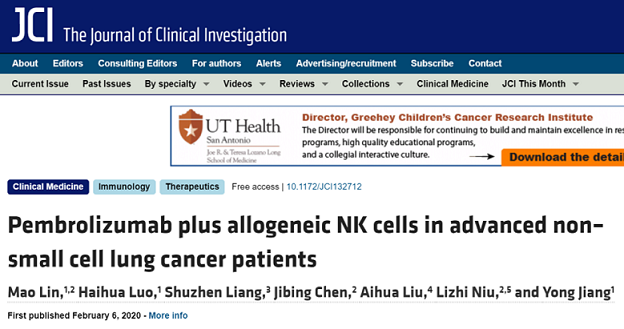 2020年5月,這個(gè)設(shè)想由國(guó)內(nèi)的研究團(tuán)隊(duì)率先實(shí)錘,證實(shí)PD-1(派姆單抗,K藥)加同種異體NK細(xì)胞在先前接受過(guò)治療的晚期NSCLC患者中安全有效。并發(fā)表在國(guó)際頂級(jí)期刊《The Journal of Clinical Investigation》上。