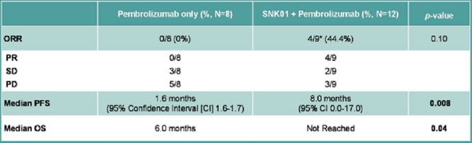 這項(xiàng)研究納入了20例IV期非小細(xì)胞肺癌(PD-L1 +,EGFR-,ALK-),這些患者接受了一線鉑類治療并失敗了,隨機(jī)分配至兩組:A組接受PD-1(派姆單抗)+SNK01治療(每六周2 x 10?或4 x 10?個(gè)細(xì)胞)B組患者僅接受派姆單抗,在21天周期的第1天注射。