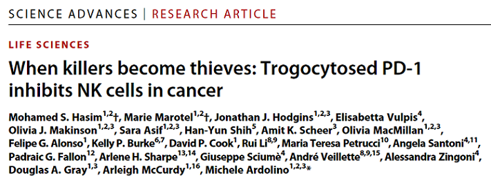 近日,該研究以:When killers become thieves: Trogocytosed PD-1 inhibits NK cells in cancer 為題發(fā)表在了 Science 子刊 Science Advances 上 。