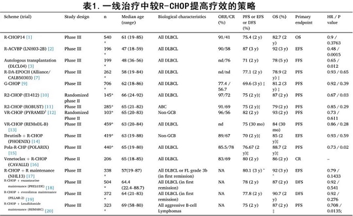 表1匯總了試圖改善DLBCL一線療效的幾種策略。