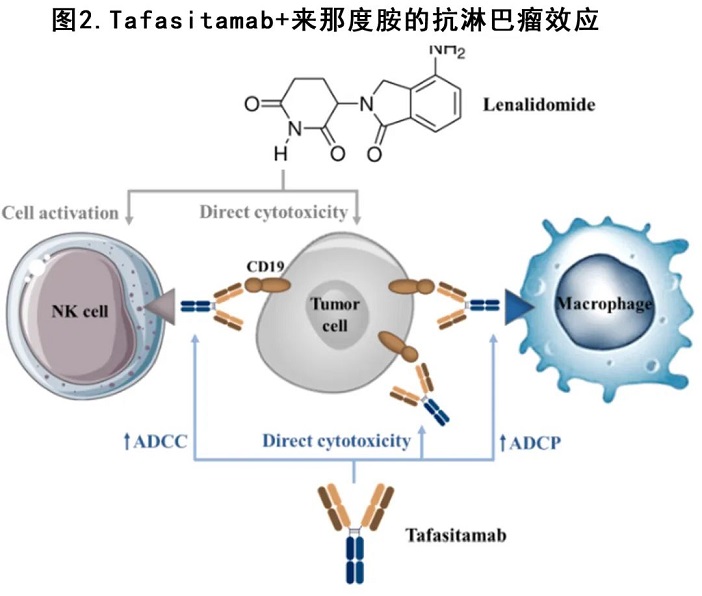 Tafasitamab 是一種 Fc 增強的人源化抗CD19單抗,在 B 細胞惡性腫瘤中表現(xiàn)出活性,并與來那度胺具有協(xié)同效應(yīng),來那度胺能夠增強自然殺傷細胞介導(dǎo)的、抗體依賴性的細胞毒(圖2)。II 期多中心單臂 L-MIND 研究(表2中的[56])在不適合移植的R/R DLBCL 中評估了tafasitamab + 來那度胺 (tafa + LEN) 聯(lián)合治療。該療程包括tafasitamab + 來那度胺最長12個月,隨后 tafasitamab 單藥治療直至疾病進展。該方案非常高效,ORR為61% (CR 43%),中位緩解持續(xù)時間為21.7個月且毒性特征合理。基于該結(jié)果,2020年tafasitamab聯(lián)合來那度胺獲得FDA和EMA加速批準用于治療不適合移植的R/R DLBCL。