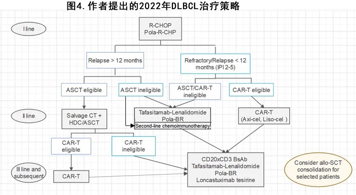 鑒于目前新的生物制劑和創(chuàng)新組合的動態(tài)格局,作者將2022年治療 DLBCL 的可能策略總結(jié)于圖4,但是正如一首著名歌曲所說“這是一個變革的時代”( “the times they are a-changing”),這一策略可能需要在不久的將來隨著正在進行的研究發(fā)表結(jié)果而進行更新。